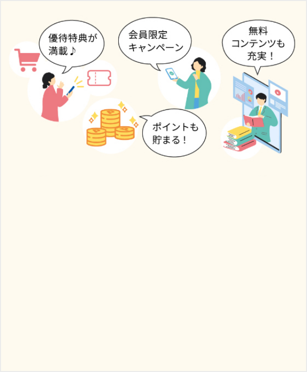 メンタルヘルス相談(初回無料)、家庭⽤常備薬の割引、健康ポータル、健康ポイントプログラムなど、会員様とご家族の⼼と体をサポートします。
